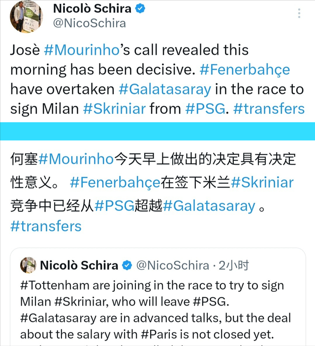 呵呵!会说就多说两句,来自男随队Hamzaoglu的消息,费内巴切成功说服了什克里尼亚尔前往土耳其。费内巴切与球员进行了对话,并问他:‘你是想与穆里尼奥共事,还是与奥坎·布鲁克(加拉塔萨雷教练)共事?’